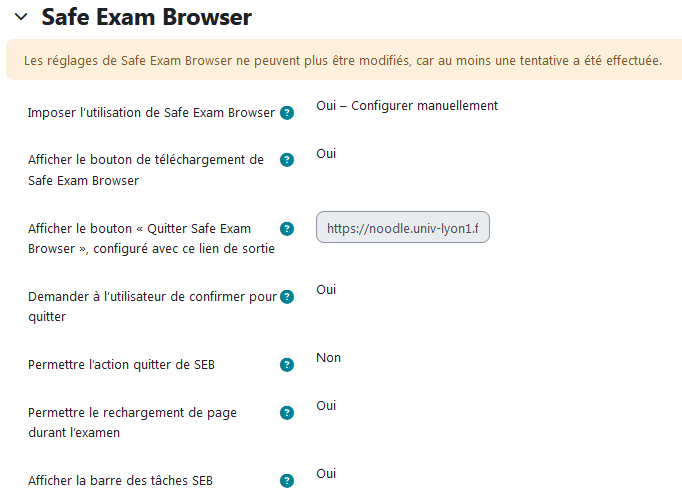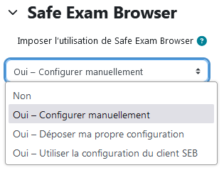 Dans les paramètres de l’activité Test (catégorie Safe Exam Browser) :